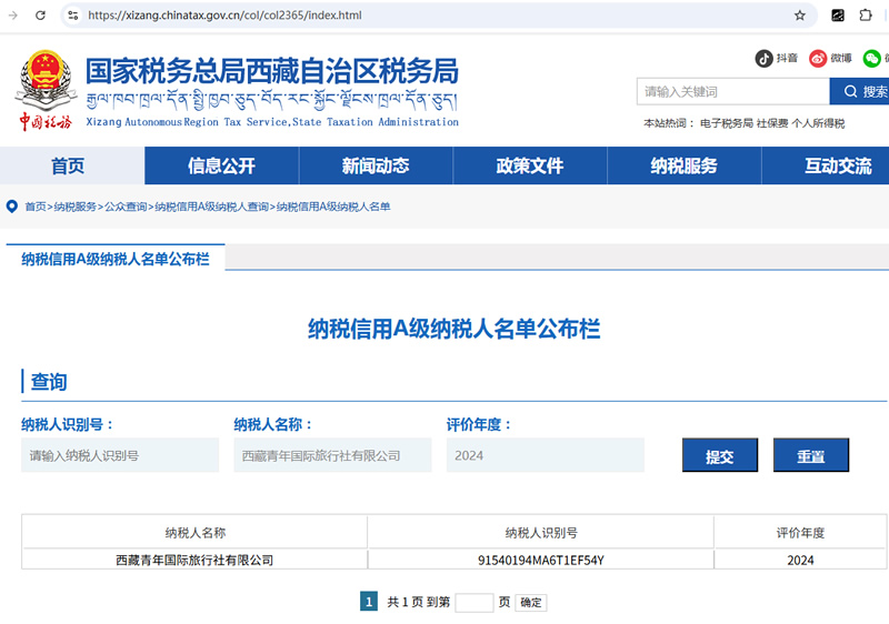 西藏青年国际旅行社荣誉:A级纳税人